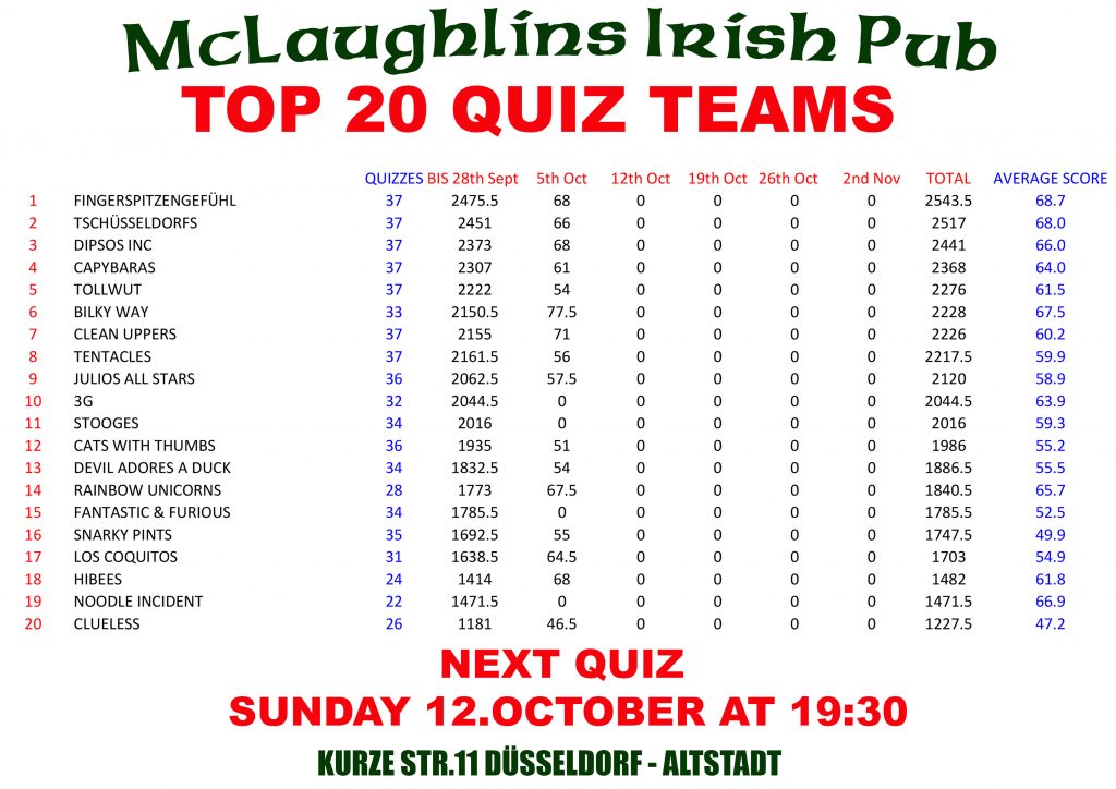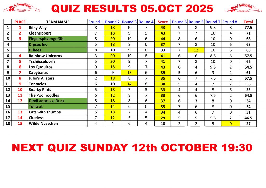 Quiz Team Rankings 2025 – The Next Quiz Is On Sunday 12.Oct @ 19:30. New Teams Always Welcome. It Is Recommended To Book A Table For The Quiz As It Fills Up Very Quickly.
