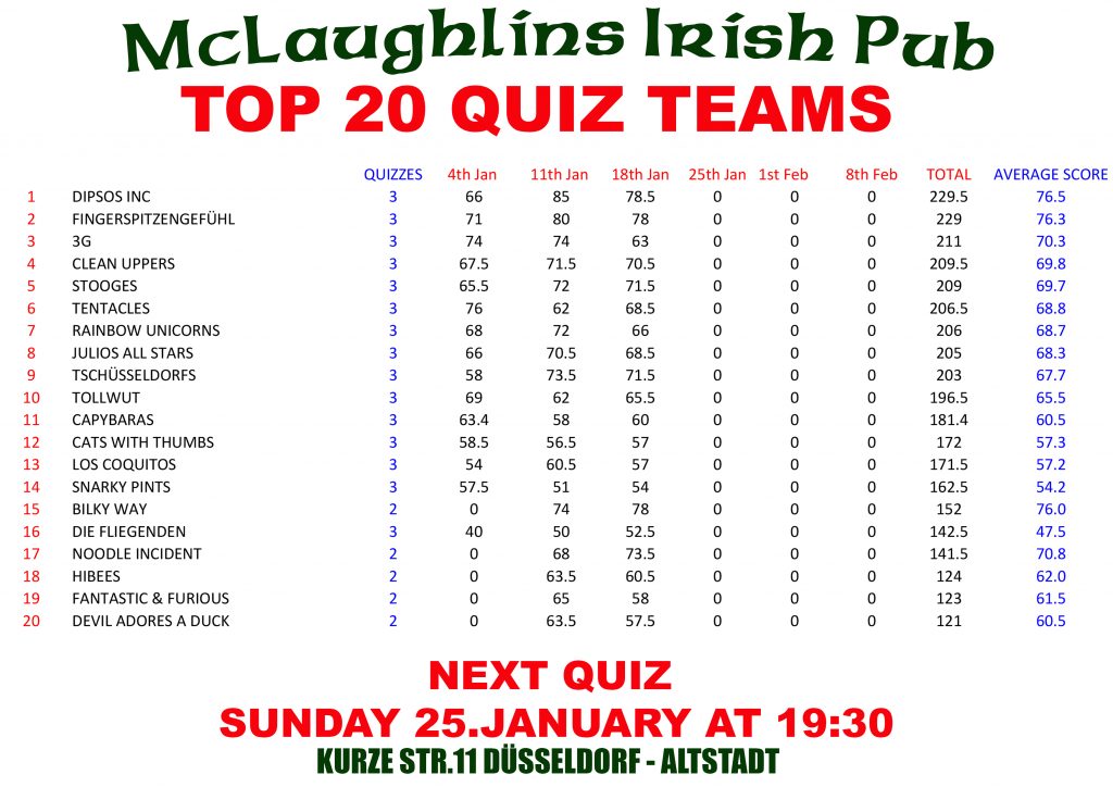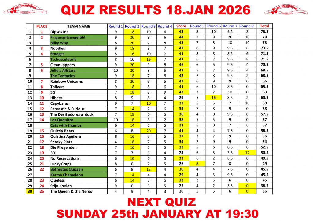 Quiz Team Rankings 2025 – The Next Quiz Is On Sunday 14. Dec @ 19:30. New Teams Always Welcome. It Is Recommended To Book A Table For The Quiz As It Fills Up Very Quickly. Our Christmas Quiz Special On Sunday 21st December Is Booked Out .