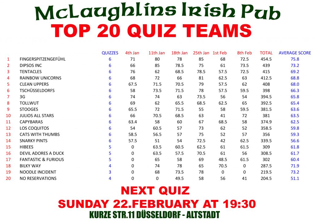Quiz Team Results For Sunday 8th 1st Feb 2026. The Next Quiz Is On Sunday 22.February @ 19:30. New Teams Always Welcome. It Is Recommended To Book A Table For The Quiz As It Fills Up Very Quickly.